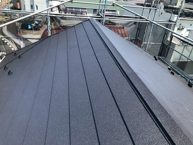 ★屋根は、カバー工法にて改修工事を行いました。カバー工法とは、現状の屋根材の上から新しい屋根をかぶせる工法です。アイジー工業社製 スーパーガルテクト仕様を採用し、既存の屋根の上にルーフィング(防水紙)を貼り、その上に軽い金属の屋根を取り付けました。