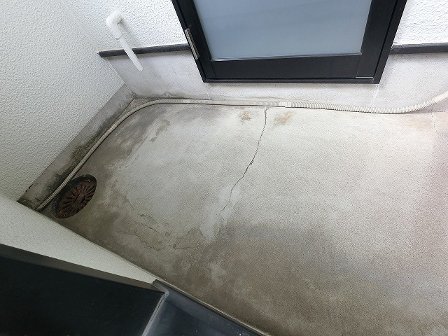 ベランダ防水:床モルタルの劣化、モルタル層のひび割れ、排水ドレン発錆