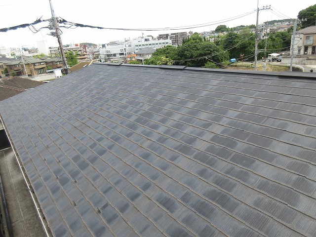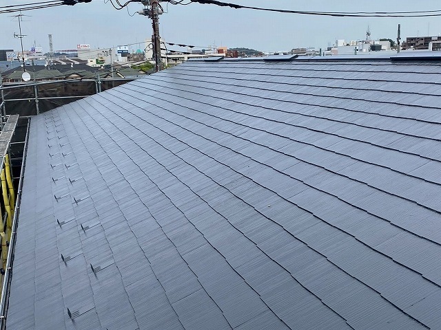 屋根は、エスケー化研のエスケープレミアムルーフSI(ナチュラルグレー)を使用し塗装いたしました。エスケープレミアムルーフSIは、ラジカルの発生を極限まで抑える技術により紫外線(UV)や水、熱等の劣化要因から屋根材を保護します。