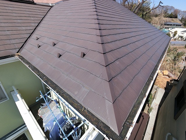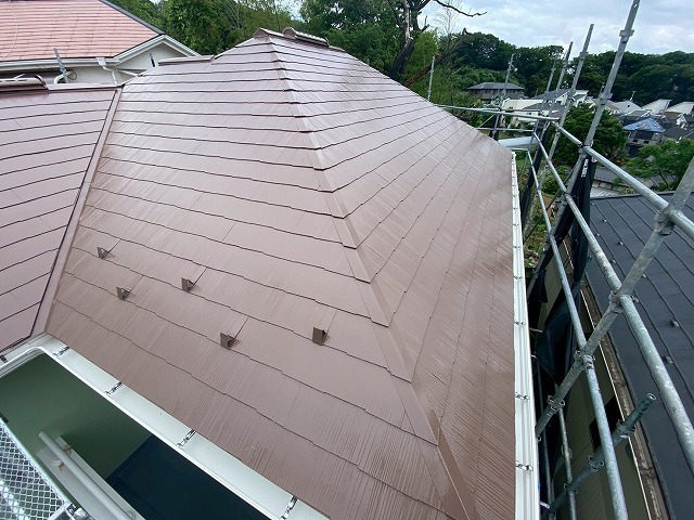 屋根は、関西ペイントのアレスクール2液Si(アンティークブラウン)にて塗装いたしました。アクリルシリコン樹脂タイプであり、耐候性に優れ、温度上昇の要因である赤外線を効率よく反射します。色彩鮮やかで光沢のある美しい仕上がりになります。