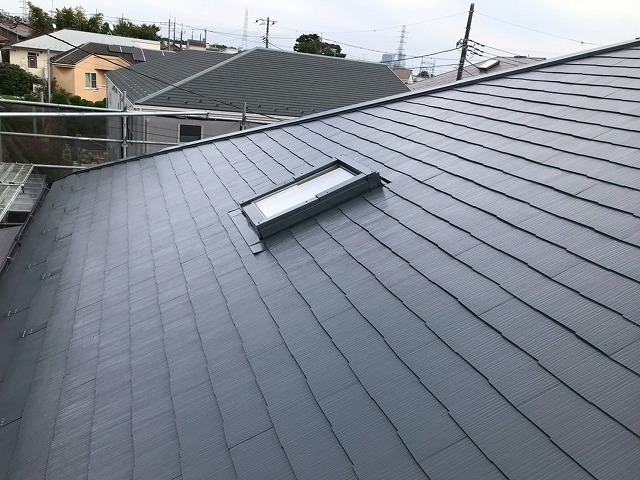 屋根は、関西ペイントのダイナミックルーフ(カーボングレー)にて塗装いたしました。ラジカル制御技術の採用による最上位品フッソに迫る高耐候性で、屋根を長期保護します。