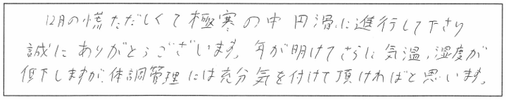 12月の慌ただしくて極寒の中、円滑に進行して下さり誠にありがとうございます。年が明けてさらに気温・湿度が低下しますが、体調管理には充分気を付けて頂ければと思います。